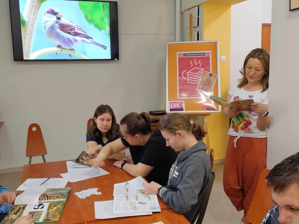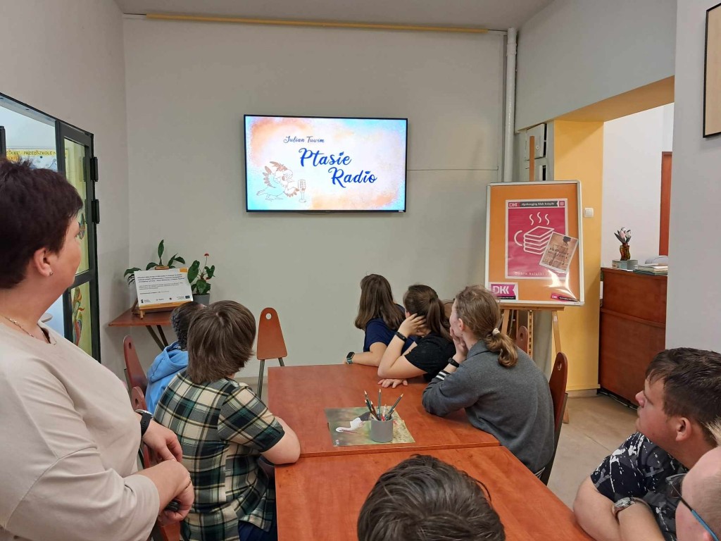 Spotkanie rozpoczęliśmy od wysłuchania wiersza Juliana Tuwima pt.,, Ptasie Radio" w wykonaniu Ireny Kwiatkowskiej bezbłędnie naśladującej odgłosy ptasiej audycji. Następnie dzieciaki wzięły udział w przeróżnych zadaniach i łamigłówkach związanych z ptasim świętem.