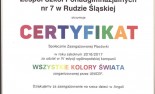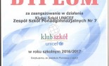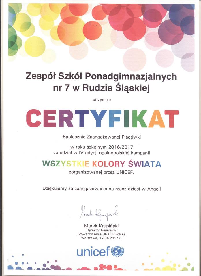 Nowy rok szkolny rozpoczął się dla nas bardzo pomyślenie. Organizacja UNICEF doceniła działania uczniów naszej szkoły. Za udział w IV edycji ogólnopolskiej kampanii "Wszystkie Kolory Świata" otrzymaliśmy CERTYFIKAT Społecznie Zaangażowanej Placówki. Za aktywność w ramach Klubu Szkół UNICEF otrzymaliśmy dyplom. Bardzo się cieszymy i liczymy na dalsze sukcesy.