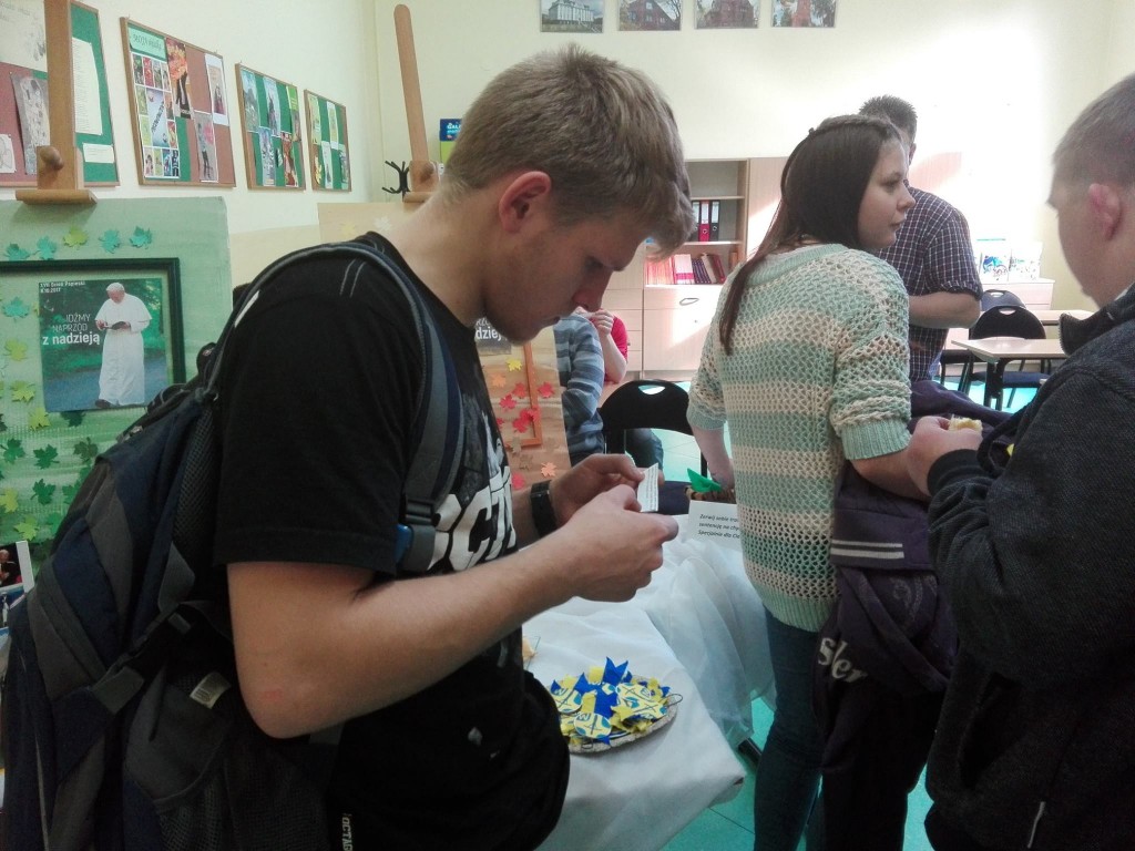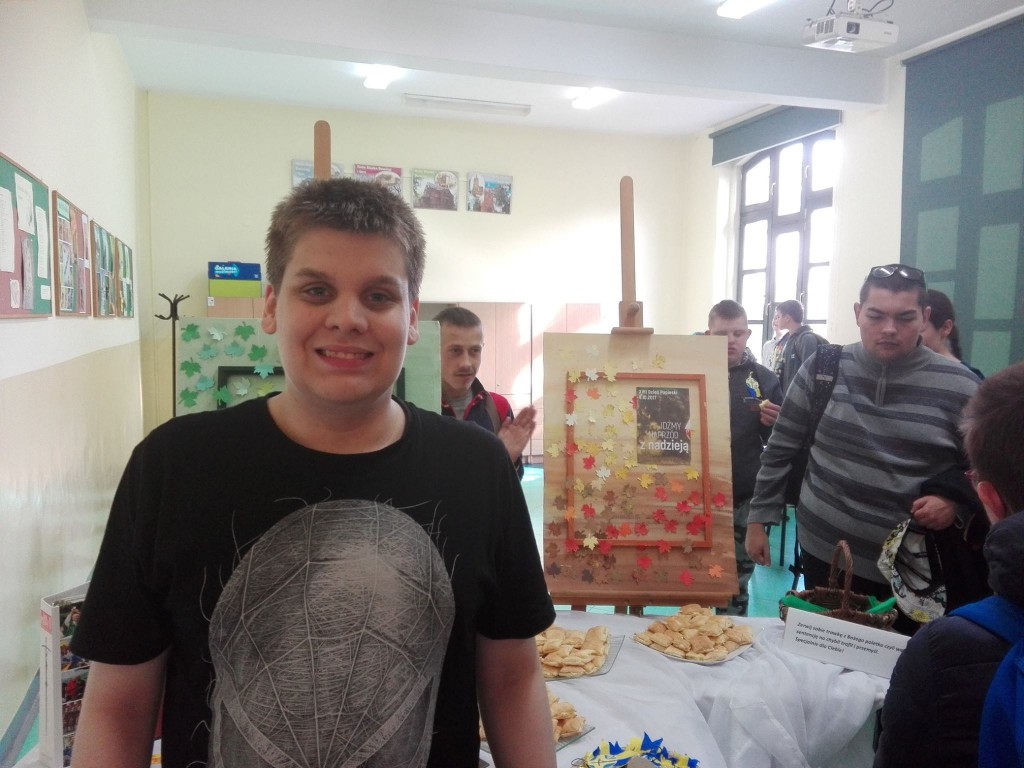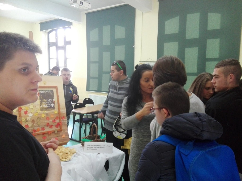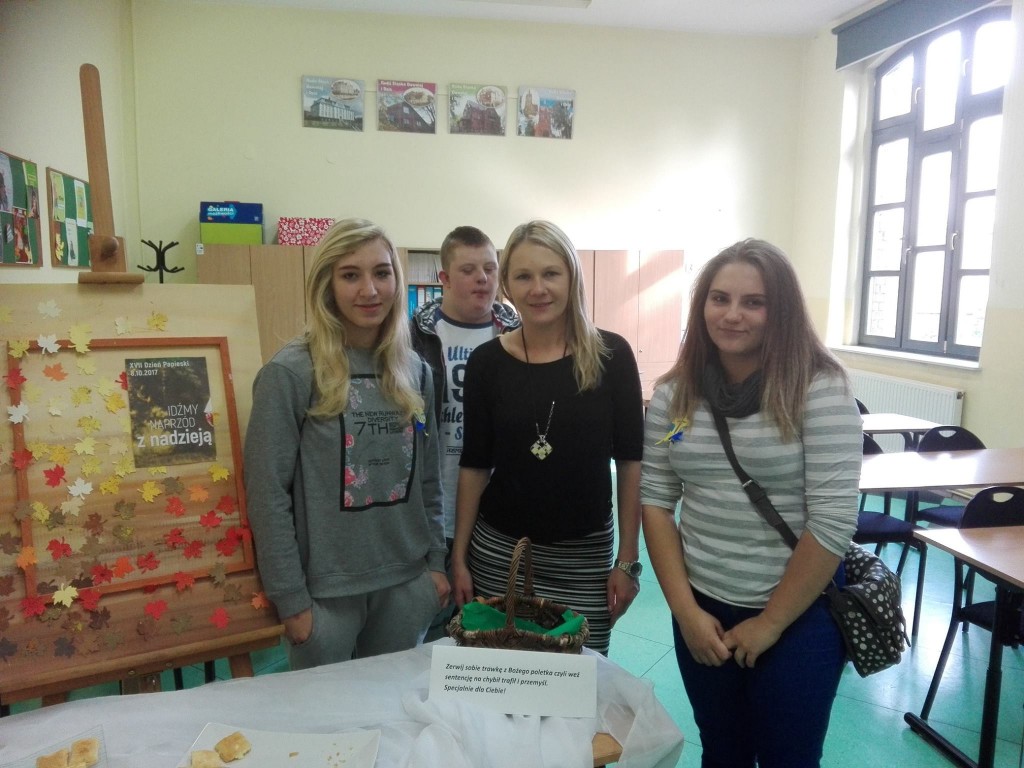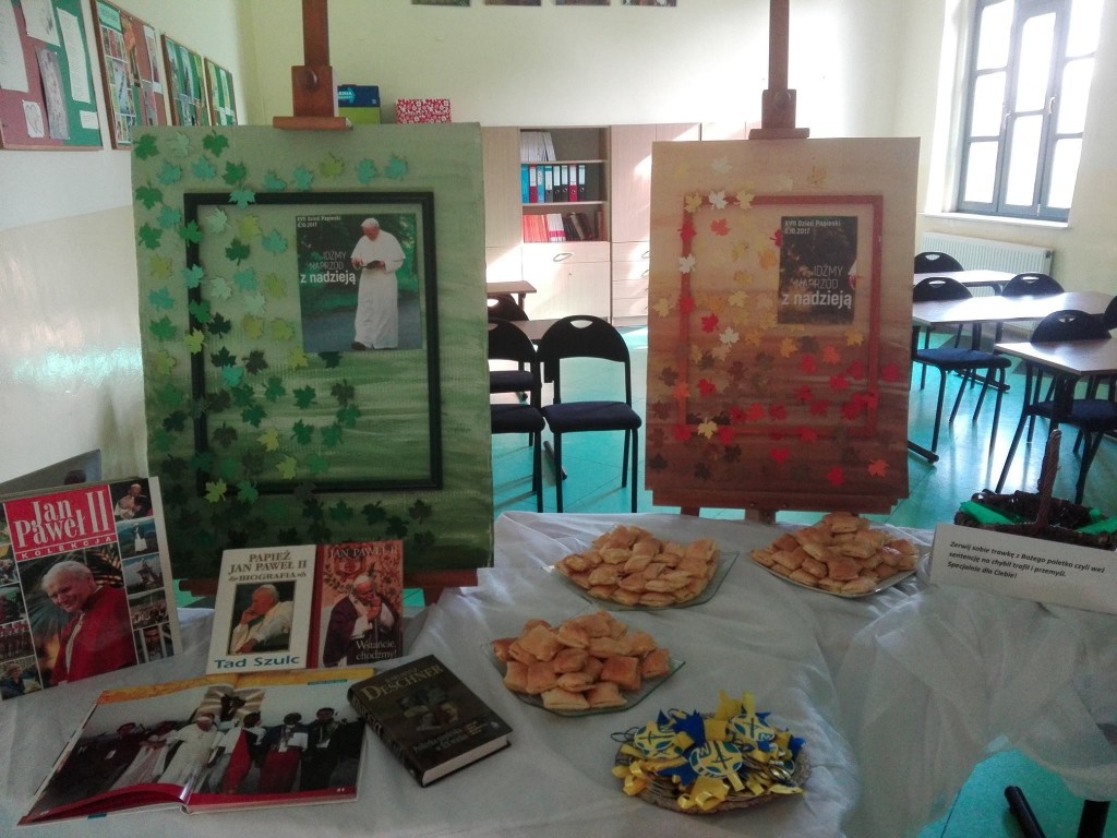 W niedzielę 8 października obchodziliśmy XVII Dzień Papieski. Tegoroczne hasło brzmiało „Idźmy naprzód z nadzieją”. Z tej okazji uczniowie naszej szkoły przygotowali symboliczne plakietki oraz upiekli pyszne kremówki. Ponadto każdy mógł zerwać trawkę z „Bożego poletka”, czyli wylosować cytat z Biblii, który może być wskazówką do przemyśleń. Dzięki tej akcji przypomnieliśmy sobie nauki świętego Jana Pawła II. Po szesnastu latach Jego słowa nie straciły nic ze swojej aktualności.