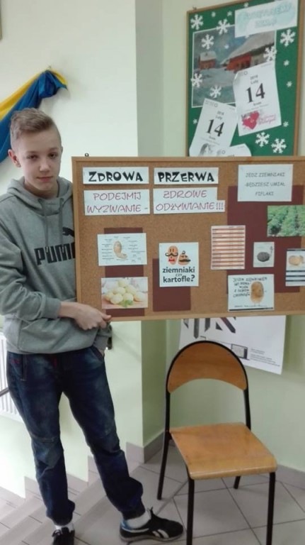 Temat zdrowego odżywiania jest obecnie bardzo modny. W naszej szkole także poświęcamy mu sporo uwagi. Przejawem tego jest cykliczna organizacja ,,zdrowej przerwy”, podczas której promujemy polską, prostą i zdrową żywność. W realizacji tego zadania pomagają nam sami uczniowie. Tym razem kucharze z klasy 1b przygotowali pyszne i sycące potrawy z ziemniaków. Podczas przerwy częstowali nimi zarówno nauczycieli jak i pozostałych uczniów szkoły. Amatorów ,,ziemniaczanego szaleństwa” było wielu. Okazuje się, że zwykły ziemniak w dobrej oprawie może z powodzeniem zastąpić niezdrową przekąskę. Już dziś czekamy na kolejną ,,zdrową przerwę”!